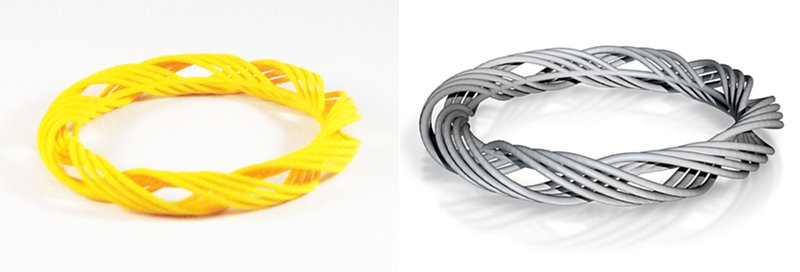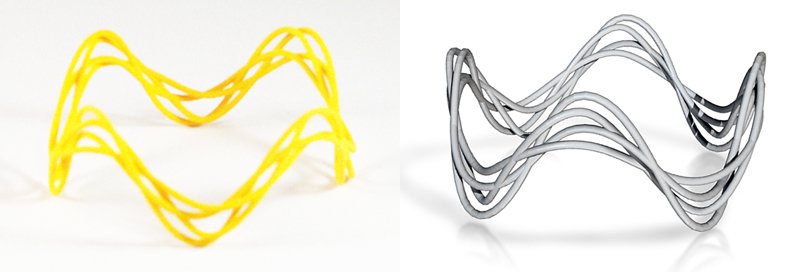Twisty Twist Bangle C01 This bangle is constructed by two twisting rods covering four revolutions of 360 degrees each, they are only held together by a single circular rod on the inside of the bangle. |