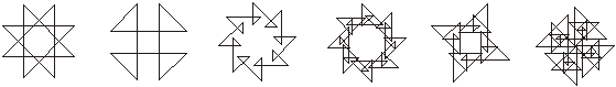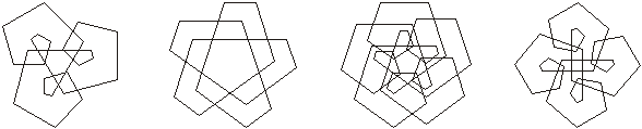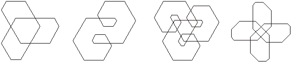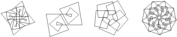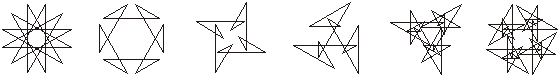 Figure 4. Spirolaterals based on an angle 180/n To test the 180/n observation, a computer program was written to generate all the possible spirolaterals of angles from 180/2 to 180/30 restricting them to a maximum of 10 turns and 10 repeats. Of these 290 possible spirolaterals, 143 were closed by the 360 degree rule; of the 143, 10 were not actually closed. Another computer program was written to enumerate other spirolaterals. The enumeration included all the angles from 1 to 180, incremented by 1 degree, and number of turns from 1 to 10 were attempted to generate a closed spirolateral, with a maximum of 10 repeats. From 1800 possible spirolaterals, 561 were closed by the 360 degree rule; of the 561, 113 were not actually closed. Of that gallery of 448 images, Figure 5 exhibits a representative selection.